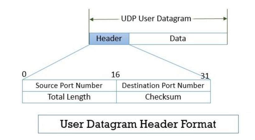 패킷을 보내는쪽은 application 계층으로부터 데이터를 받고 UDP header를 붙인다. 이것을 user datagram이라함. header는 아래 처럼 보내는쪽의 port, 받는쪽의 port 전체 datagram길이, checksum이 들어간다.